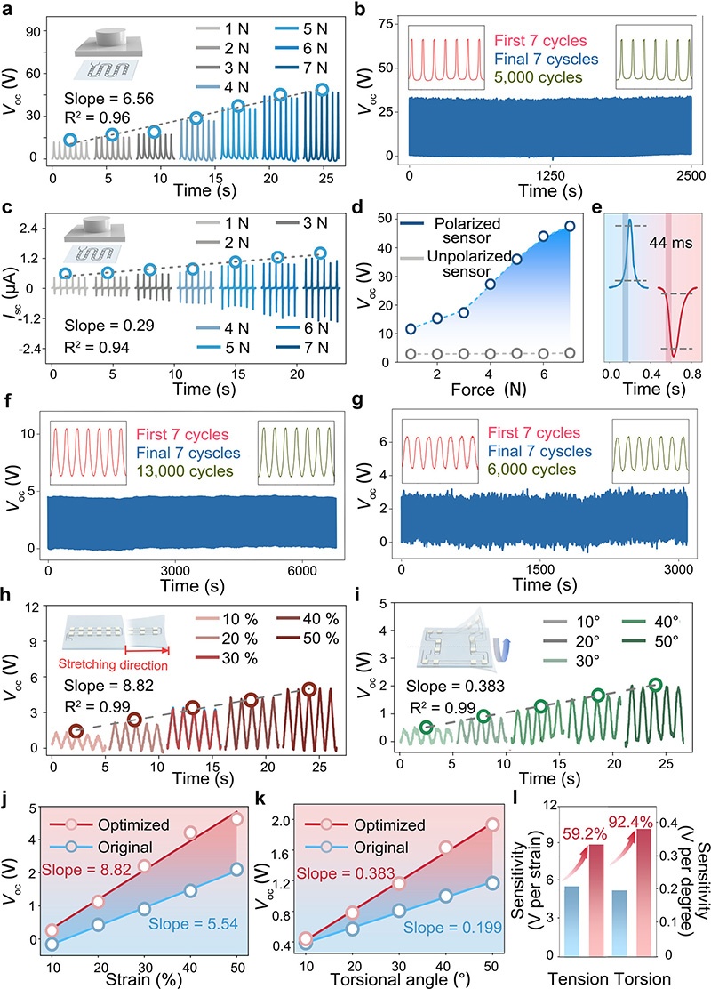 测试模式:压缩、拉伸、扭转;优化后传感器拉伸灵敏度14.0 V/应变,扭转灵敏度0.10 V/度,较未优化分别提升59.2%、92.4%。