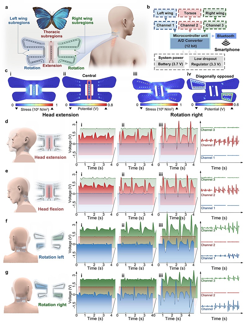 仿蝴蝶翅膀对称分区结构,设计三通道传感器:中部监测屈伸,左右翼监测扭转,通过多通道信号区分运动类型与幅度。
