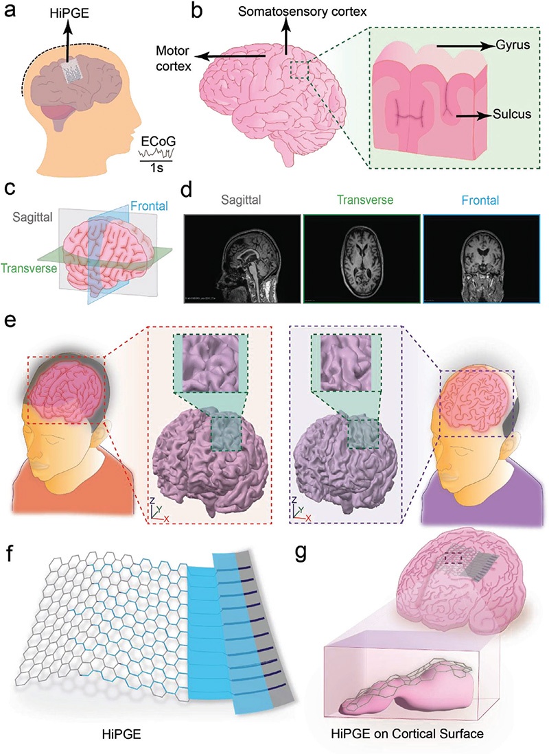(a) 个性化HiPGE在体感皮层和运动皮层(指定ROI)进行ECoG记录的原理图;(b) ROI示意图,展示大脑皮层的脑回(gyrus)和脑沟(sulcus)解剖结构;(c,d) 三个解剖平面示意图(c),以及矢状面、横断面、额状面的MRI结构图像展示(d);(e) 不同个体皮层表面的差异展示,以及脑回结构的截面放大图(330号患者为左利手,349号患者为双利手);(f) HiPGE设计示意图;(g) 植入后贴合皮层表面的HiPGE侧视图。