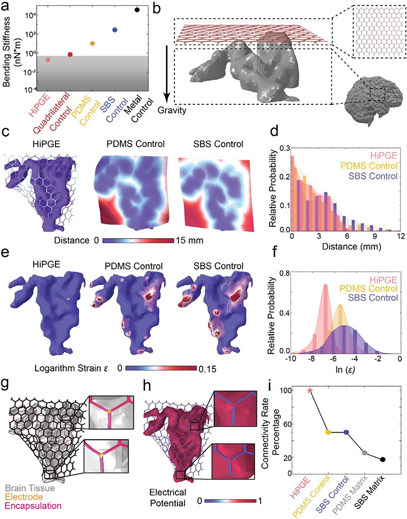 (a) HiPGE(粉色星标)、脑组织(灰色矩形)与其他对照器件的弯曲刚度对比;(b) 贴合性仿真设置示意图,HiPGE悬浮于MRI重建的3D大脑模型上方,通过重力沉降贴合脑表面;(c) 贴合性仿真后器件与脑组织贴合的最终构型,色阶图展示器件到脑表面的距离;(d) HiPGE与对照组的贴合距离分布概率直方图;(e) 贴合性仿真后变形的脑组织,色阶图展示脑组织上的对数应变分布;(f) HiPGE与对照组的对数应变分布概率直方图;(g) 脑表面HiPGE的仿真示意图;(h) 连通性仿真结果,HiPGE上的电极展现出良好的信号连通性;(i) 不同器件的信号连通率对比。