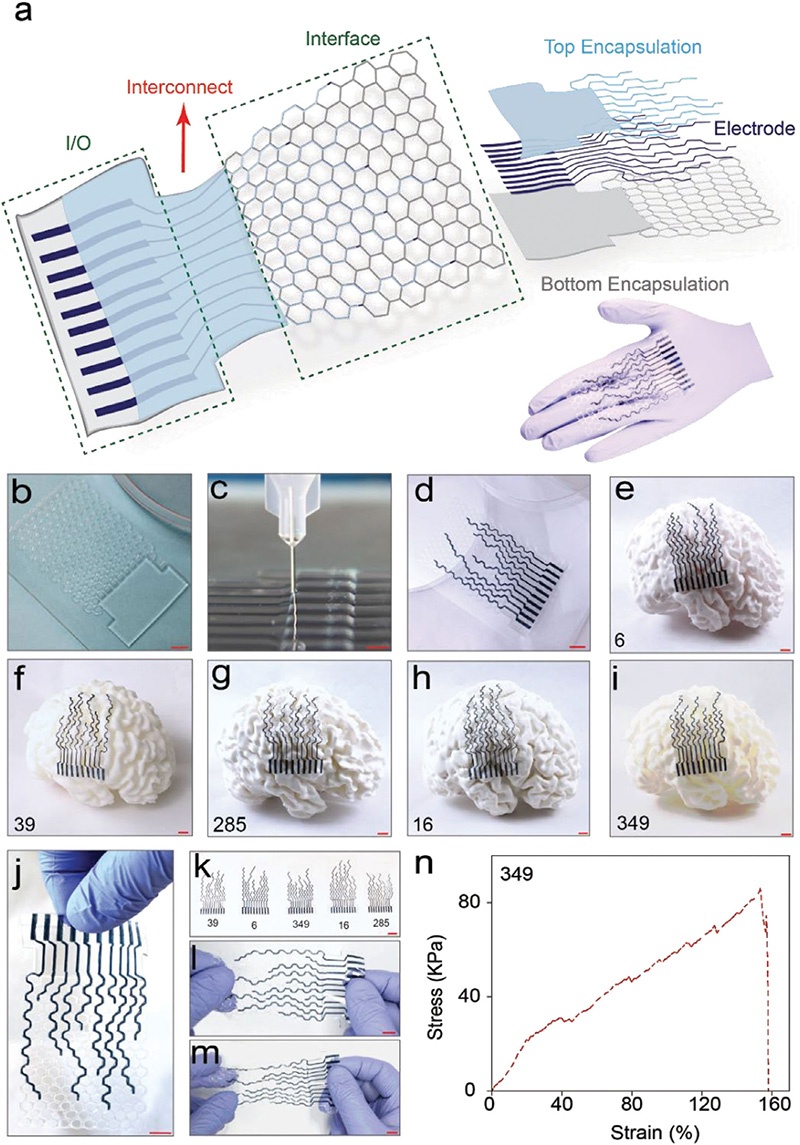 (a) HiPGE结构示意图(三层结构:底层、电极层、顶层;三个功能部分:界面区、互连区、I/O区)与3D打印实物照片;(b) 打印在玻璃基底上的单一个体器件底层照片;(c) 器件顶层打印过程图;(d) 打印在玻璃基底上的个性化HiPGE示意图;(e-i) 5款患者特异性HiPGE分别贴合对应患者大脑右半球模型的实物图(e-6号患者、f-39号患者、g-285号患者、h-16号患者、i-349号患者);(j) HiPGE易操作性展示;(k) 5款不同患者定制化HiPGE的设计与尺寸对比;(l-m) HiPGE未拉伸(l)与拉伸(m)状态的实物图;(n) 349号患者定制HiPGE的工程应力-应变曲线。