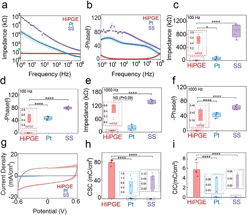 (a,b) HiPGE、铂(Pt)电极、不锈钢(SS)电极的电化学阻抗谱(EIS);(c-f) 100 Hz下的阻抗(c)与相位(d)、1000 Hz下的阻抗(e)与相位(f)对比;(g) HiPGE与对照电极的电流密度-电位曲线;(h,i) HiPGE与对照电极的电荷存储容量(CSC)(h)、电荷注入容量(CIC)(i)对比。