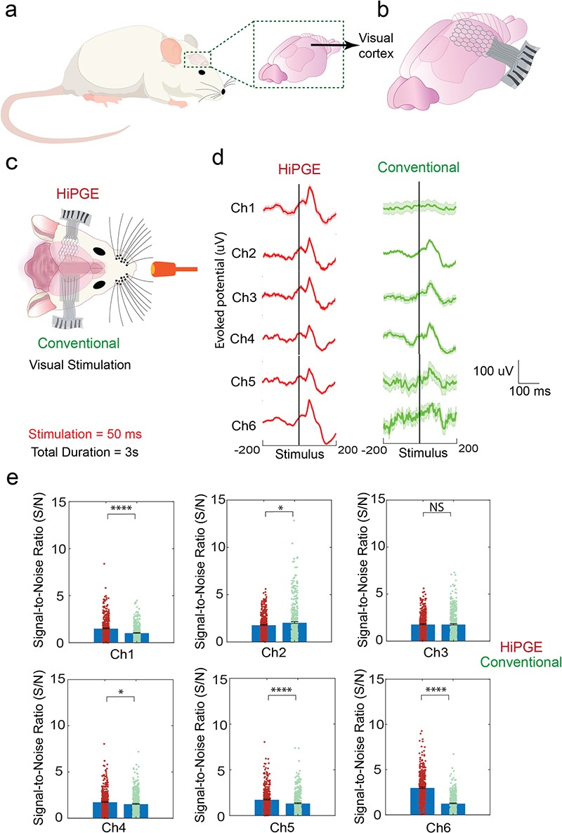 (a) 大鼠及其视觉皮层示意图;(b) 大鼠大脑视觉皮层植入HiPGE的示意图;(c) 同体实验设计示意图,左半球植入HiPGE,右半球植入传统电极,通过光刺激诱发皮层响应;(d) 清醒大鼠中HiPGE与传统电极记录的视觉诱发电位(VEPs),展示6个通道的试次平均波形;(e) 所有动物的信噪比(SNR)量化结果对比。
