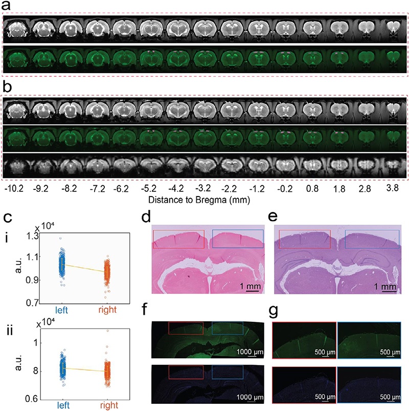 (a,b) 手术前(无HiPGE)(a)与手术后(植入HiPGE)(b)大鼠大脑的结构与功能MRI图像;(c) 手术前后大鼠左、右体感运动皮层的体素信号强度对比;(d-g) 植入4周后大鼠大脑的组织学染色结果:Masson三色染色(d)、H&E染色(e)、Iba-1/DAPI免疫荧光染色(f),以及植入区与非植入区的放大视图(g)。