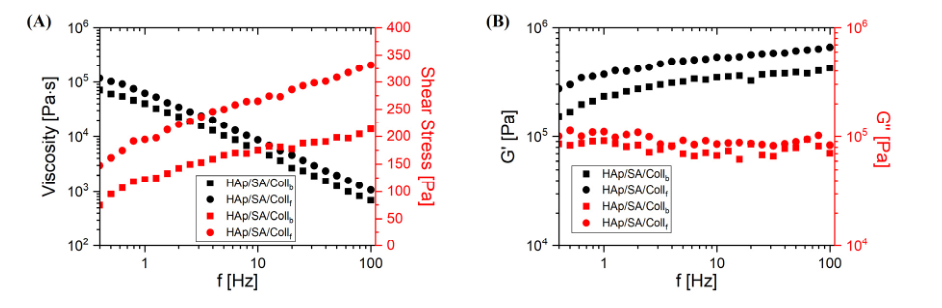 ① 频率<0.3 Hz时,两种墨水测试数据不稳定(黏度随机骤降),故仅分析0.4–100 Hz数据;② 两者均为非牛顿剪切变稀流体:频率升高时,黏度显著降低,剪切应力明显升高;其中Coll₆基墨水黏度略高于Collᵦ基墨水;③ 黏弹性:两者均表现为"类固体行为"(全频率范围G'>G''),G'随频率适度升高,G''基本不随频率变化;该特性保障挤出时细丝结构完整性。