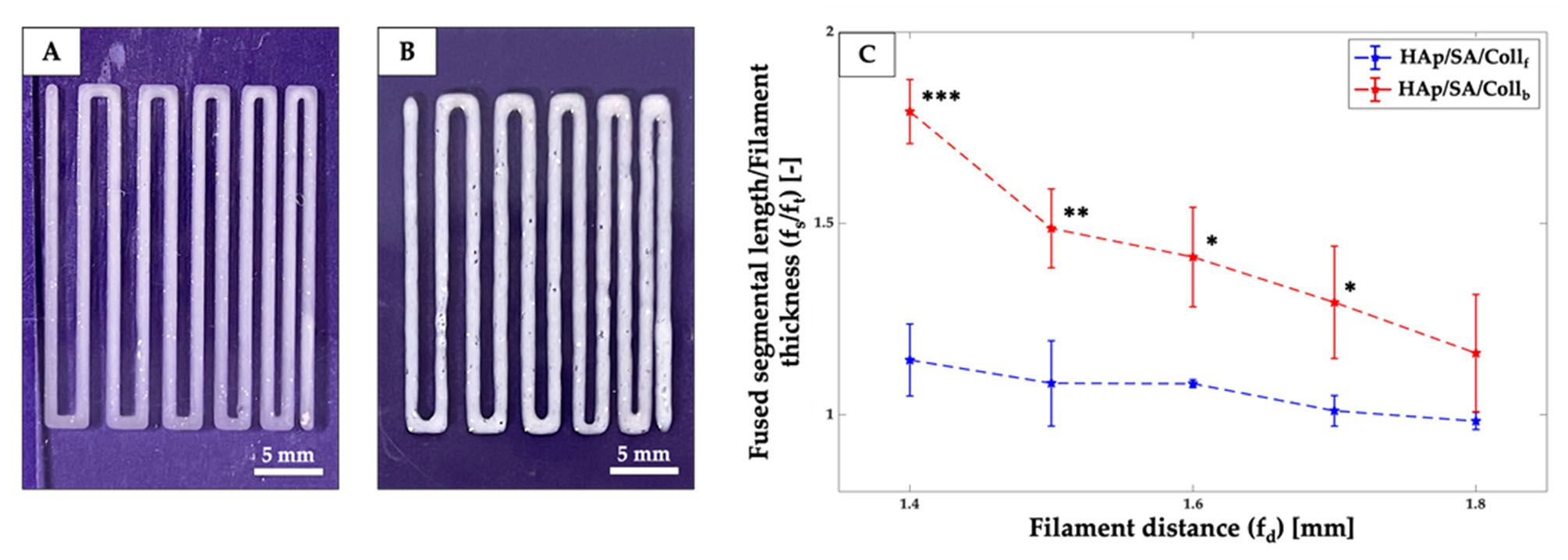 细丝融合测试:相邻细丝存在轻微融合趋势,且随间距(f_d)减小更显著;f_d=1.4 mm(最小间距)时,HAp/SA/Coll₆墨水的fₛ显著低于HAp/SA/Collᵦ墨水(p≤0.001),表明其打印分辨率更优,可构建更精细结构。