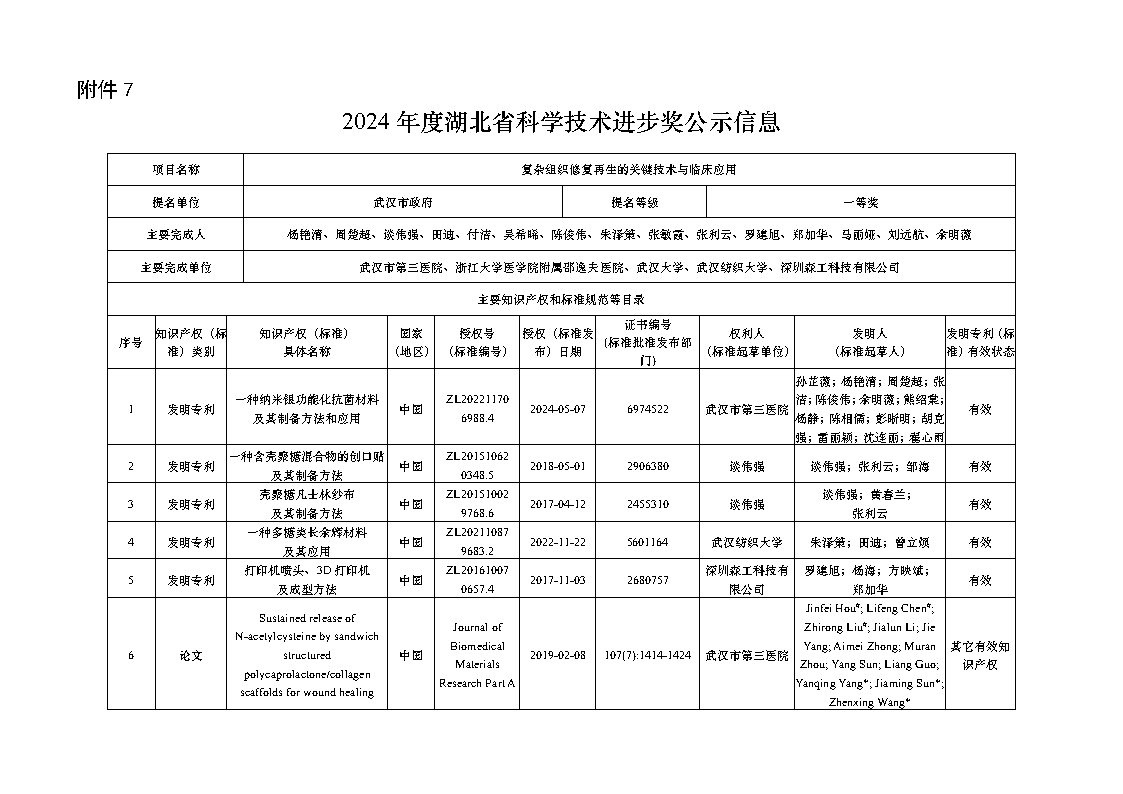 由武汉市第三医院杨艳清主任团队完成的“复杂组织修复再生的关键技术与临床应用”项目拟提名2024年度湖北省科学技术进步奖。按照湖北省科技厅《关于开展2024年度科学技术奖提名工作的通知》要求,我司作为第五完成单位对该项目基本情况进行公示(详见附件),公示时间为2024年5月10日至2024年5月16日。