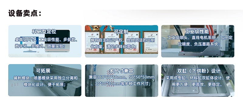 设备搭载工业级压电式喷头与负压闭环墨路系统,确保设备墨水粘度兼容性高、墨滴控制精确,适合科研和小型样件高精度打印。采用模块化双缸体设计,支持160*60*60mm、50*50*50mm、30*30*30mm等多种尺寸缸体模式,小缸体便于快速验证材料,大缸体满足稳定性测试。