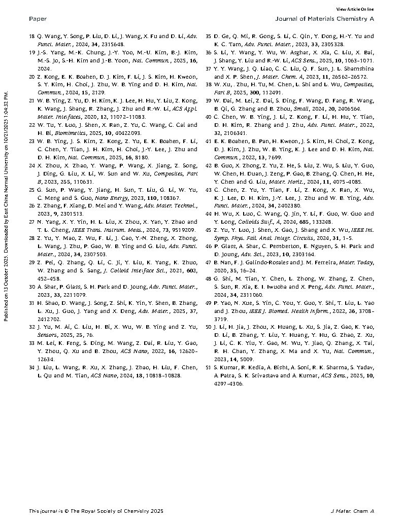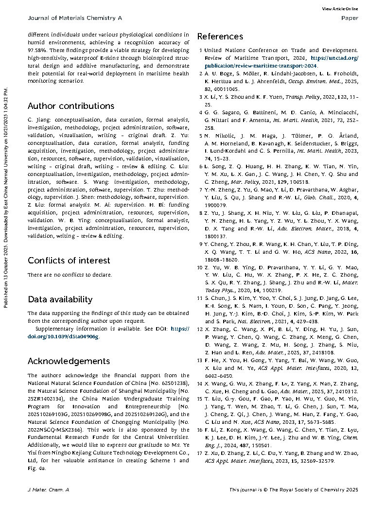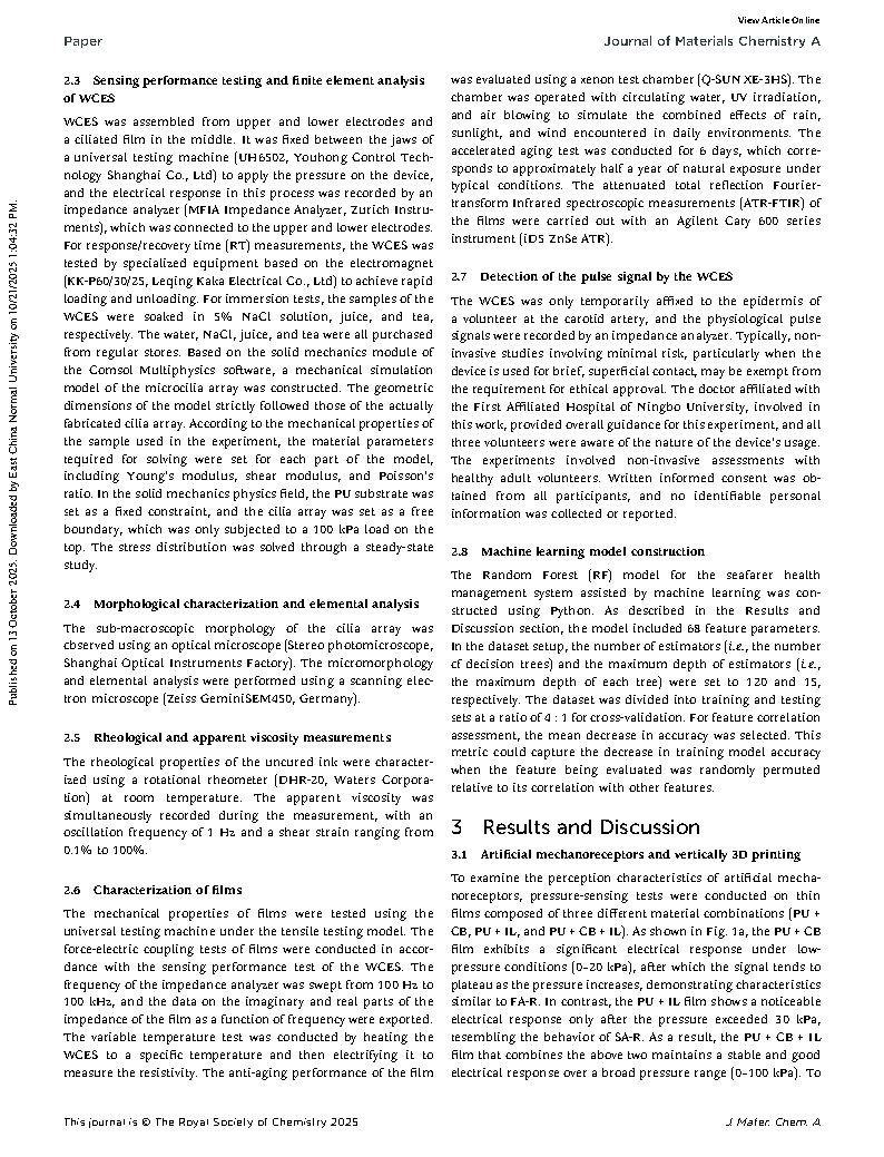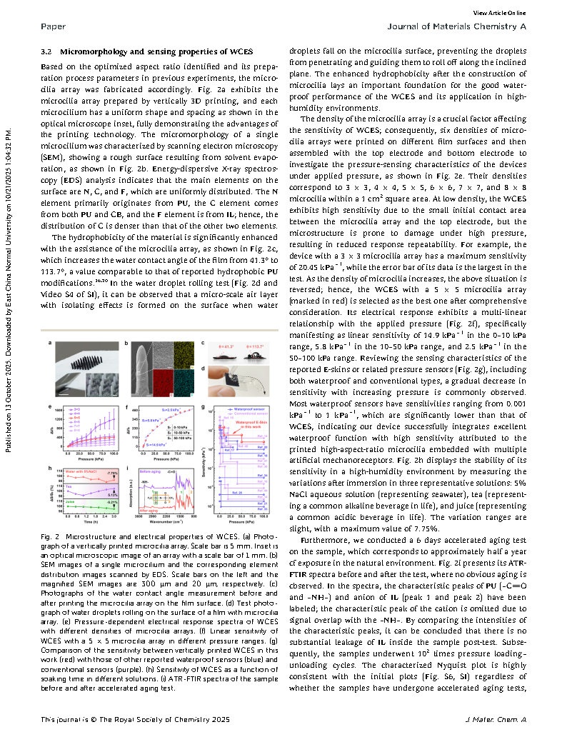 华东师范大学通信与电子工程学院/集成电路学院郁哲助理研究员与韩国科学技术院(KAIST)应邬彬副教授在材料科学领域国际顶级期刊《Journal of Materials Chemistry A》发表题为 “Multiple artificial mechanoreceptor-embedded waterproof ciliated E-skin via direct-ink-writing vertically 3D printing toward health management of seafarers” 的高水平研究论文(DOI: 10.1039/d5ta04906g)。在该研究中,森工科技研发生产AutoBio1000 3D打印机高效的完成了高纵横比微纤毛的垂直 3D 打印制备环节,为新型防水纤毛电子皮肤(WCES)的性能突破提供了核心技术支撑。