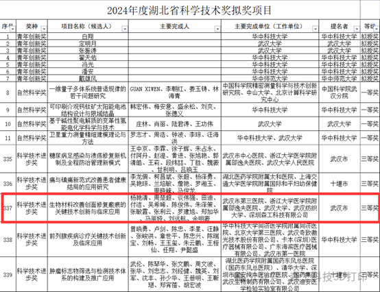 近日,由深圳森工科技有限公司参与的重要项目—“生物3D材料改善创面修复瘢痕的关键技术创新与临床应用”荣获湖北省科学技术进步奖三等奖。