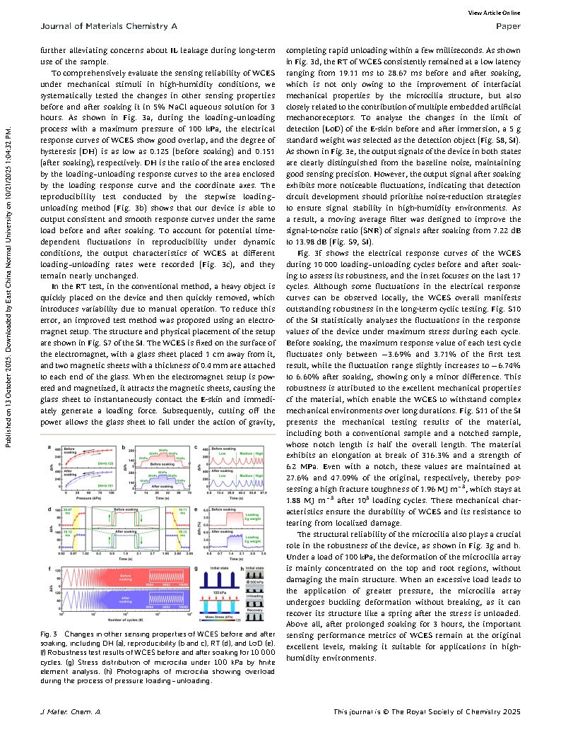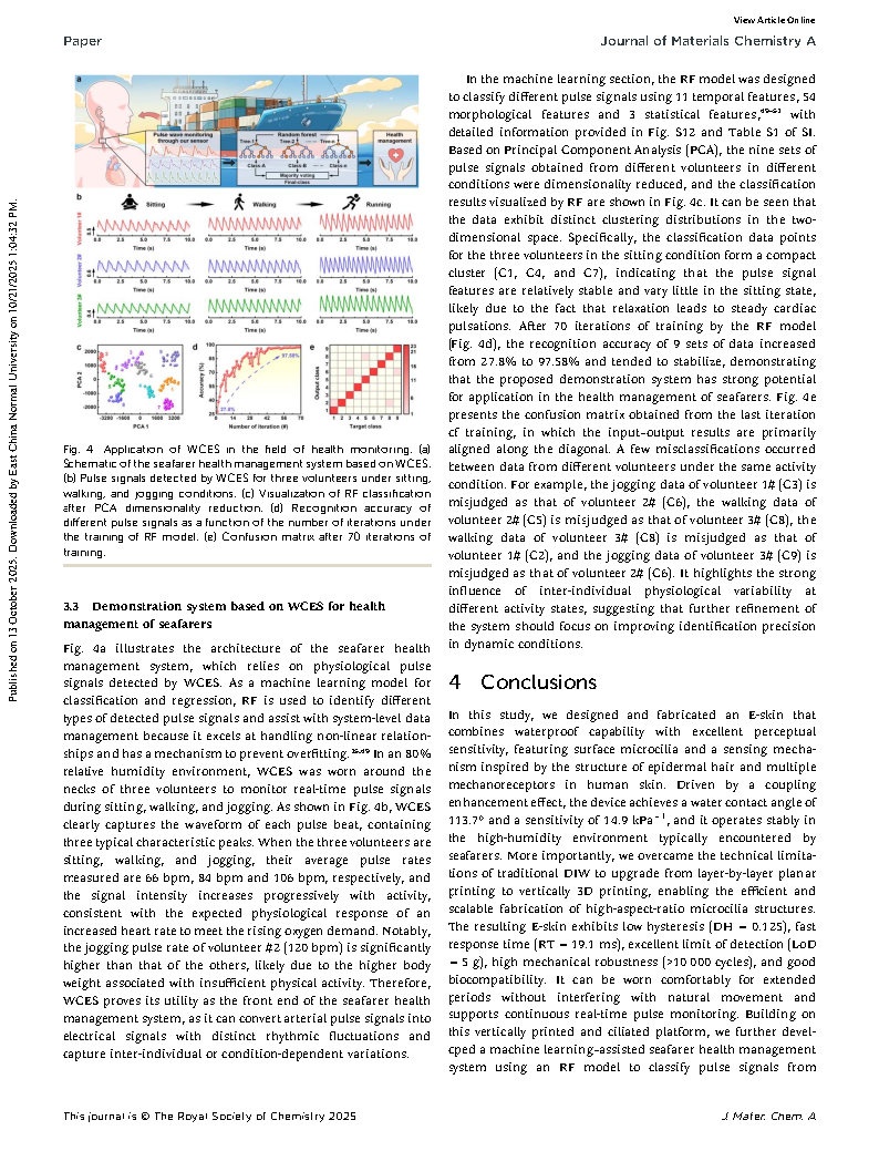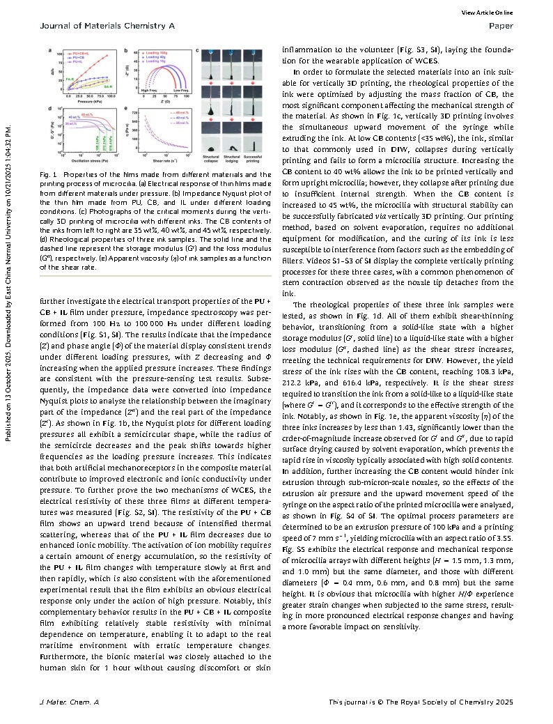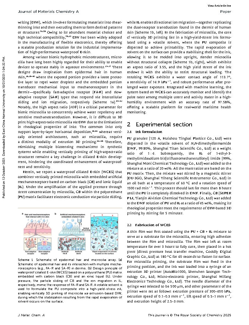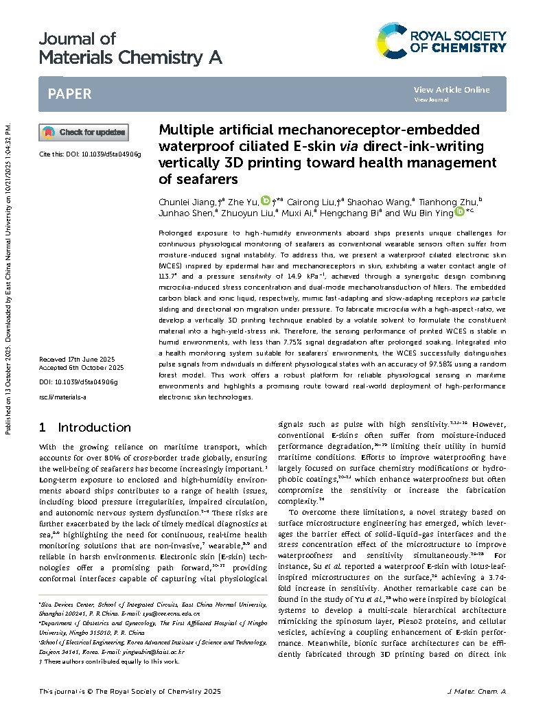 华东师范大学通信与电子工程学院/集成电路学院郁哲助理研究员与韩国科学技术院(KAIST)应邬彬副教授在材料科学领域国际顶级期刊《Journal of Materials Chemistry A》发表题为 “Multiple artificial mechanoreceptor-embedded waterproof ciliated E-skin via direct-ink-writing vertically 3D printing toward health management of seafarers” 的高水平研究论文(DOI: 10.1039/d5ta04906g)。在该研究中,森工科技研发生产AutoBio1000 3D打印机高效的完成了高纵横比微纤毛的垂直 3D 打印制备环节,为新型防水纤毛电子皮肤(WCES)的性能突破提供了核心技术支撑。