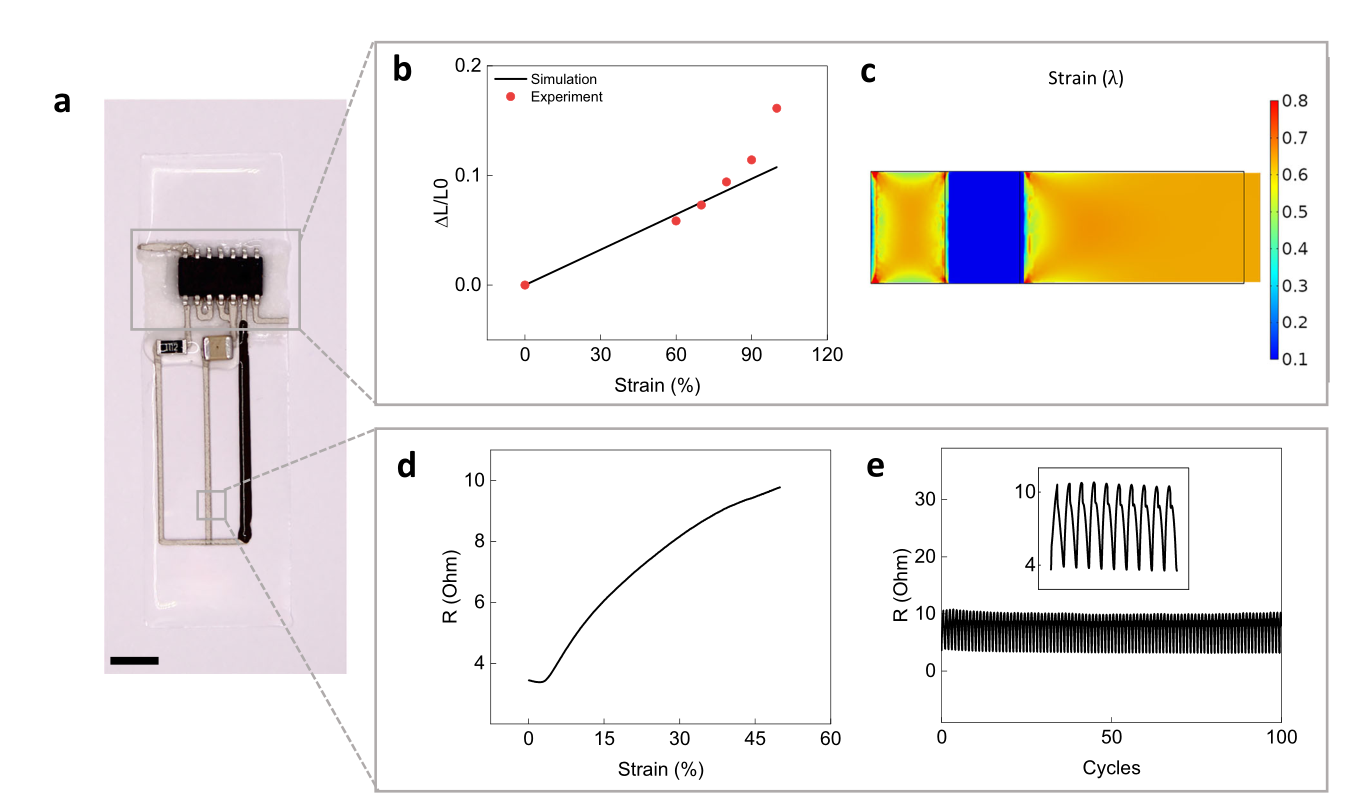 本研究提出“混合 3D 打印”策略:在单一平台上完成多材料直写与贴片封装,将高性能硅基环形振荡器与可拉伸负阻复合材料(NPC)异构集成,制备出仿生 SA-II 人工传入神经。