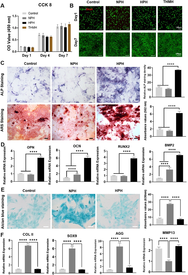 2. 体外生物性能:CCK-8法和活死细胞染色证明THMH具有优异的生物相容性;Alcian蓝染色、RT-PCR和免疫荧光染色显示NPH层能显著促进BMSCs成软骨分化,抑制软骨肥大分化;ALP染色、AR染色、RT-PCR和免疫荧光染色表明HPH层可有效促进BMSCs成骨分化。