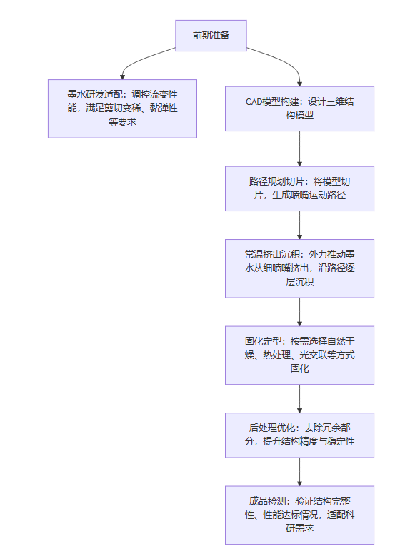 要搞懂DIW的核心竞争力,先从“工艺+墨水”这对CP说起。其流程和传统3D打印大同小异,先建CAD模型、切片生成路径,再靠外力将墨水从喷嘴挤出沉积。但关键差异在于,DIW无需加热,墨水的流变性能直接决定“打印效果上限”,这也是科研er们重点攻关的方向。适配DIW的墨水必须具备“三项全能”:一是剪切变稀性,就像牙膏一样,受力时黏度下降好挤出,松手后迅速定型不溃散;二是黏弹性,得有足够“支撑力”,避免层间坍塌,复杂结构也能稳稳hold住;三是屈服应力平衡,既要喷得顺畅,又要沉积后快速定形,不能“软塌塌”。实际应用中,墨水黏度通常在10²至10⁶ mPa·s之间,1s⁻¹左右的剪切速率下加工性能最佳,固化方式也可按需选择,自然干燥、热处理、光交联等都能适配,完美匹配不同材料的功能需求。
